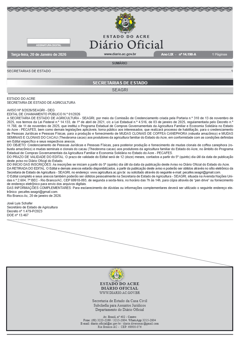 Com a assinatura do edital, o governo estadual espera ampliar a produção de café, gerar emprego e renda no interior e consolidar uma política de compras públicas que fortaleça a agricultura familiar e a economia solidária no Acre. A medida foi publicada em edição extra do Diário Oficial do Acre desta terça-feira (20).