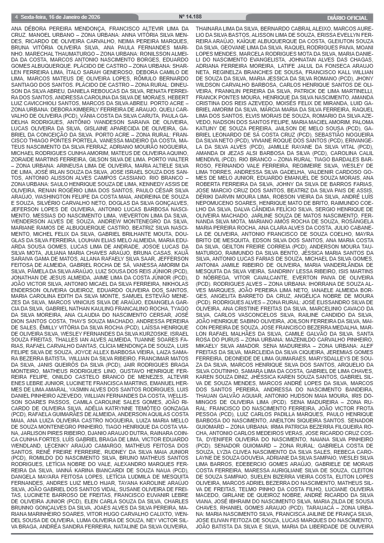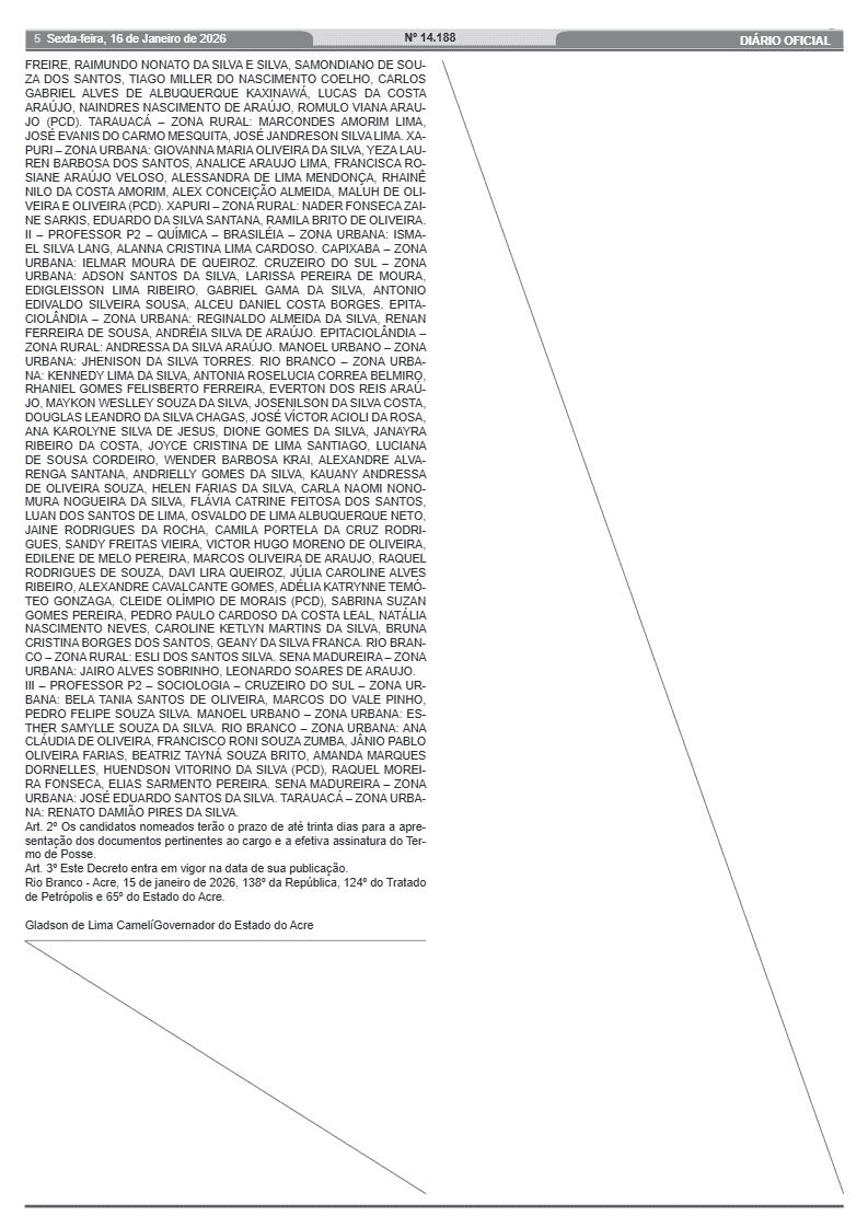O Governo do Acre publicou no Diário Oficial do Estado (DOE) desta sexta-feira (16), decreto que oficializa a nomeação de centenas de aprovados no concurso público da Secretaria de Estado de Educação e Cultura (SEE). Ao todo, o decreto reúne mais de 100 nomeações, distribuídas entre cargos administrativos e do magistério, com lotações em praticamente todos os municípios acreanos