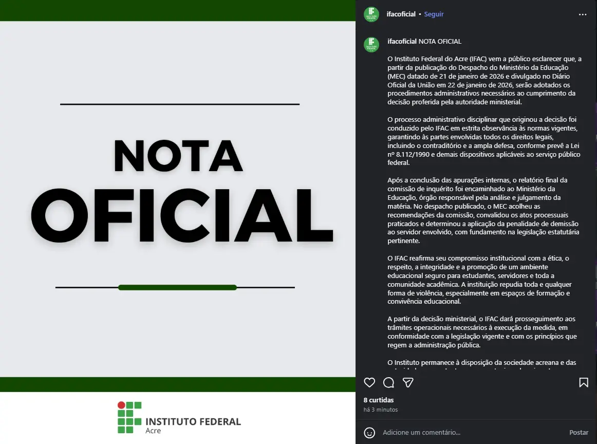 O Instituto Federal do Acre (Ifac) informou na manhã desta quinta-feira, 22, que dará cumprimento à decisão do Ministério da Educação (MEC) que determinou a demissão de um professor da instituição, após a conclusão de processo administrativo disciplinar. A manifestação foi feita por meio de nota oficial divulgada nas redes sociais, após a publicação do despacho ministerial no Diário Oficial da União.