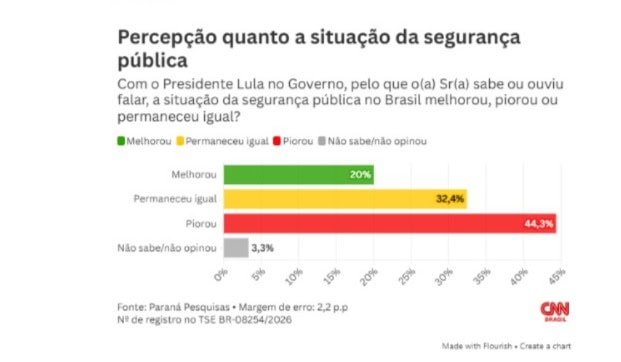 A maior parte da população, 44,3%, diz que a segurança pública piorou durante o governo do presidente da República, Luiz Inácio Lula da Silva (PT), segundo um levantamento divulgado pelo instituto Paraná Pesquisas neste sábado (31).