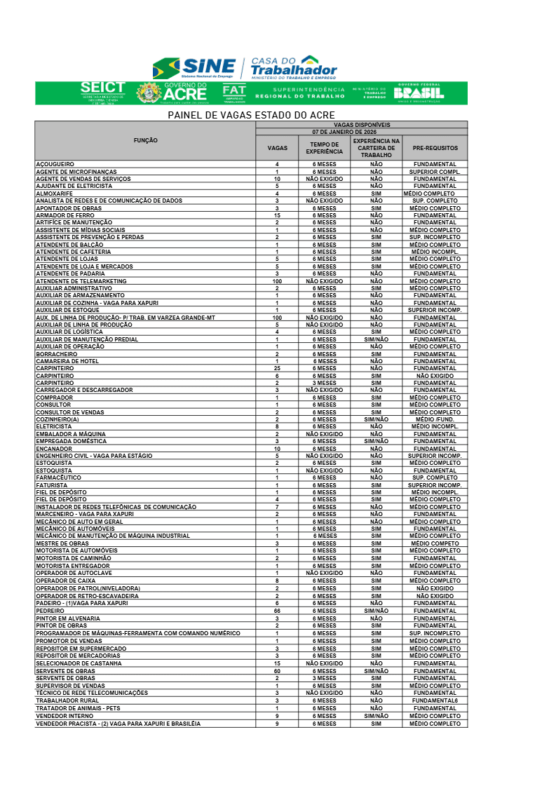 O Sistema Nacional de Emprego (Sine) do Acre divulgou nesta quarta-feira, 7, um novo painel com 642 vagas de trabalho disponíveis em Rio Branco. As oportunidades abrangem diferentes áreas profissionais e contemplam candidatos com variados níveis de qualificação.