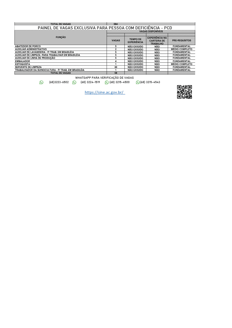 O levantamento também aponta a disponibilização de oito vagas exclusivas para pessoas com deficiência (PCDs), reforçando o compromisso do Sine Acre com a promoção da inclusão e da diversidade no mercado de trabalho do estado.