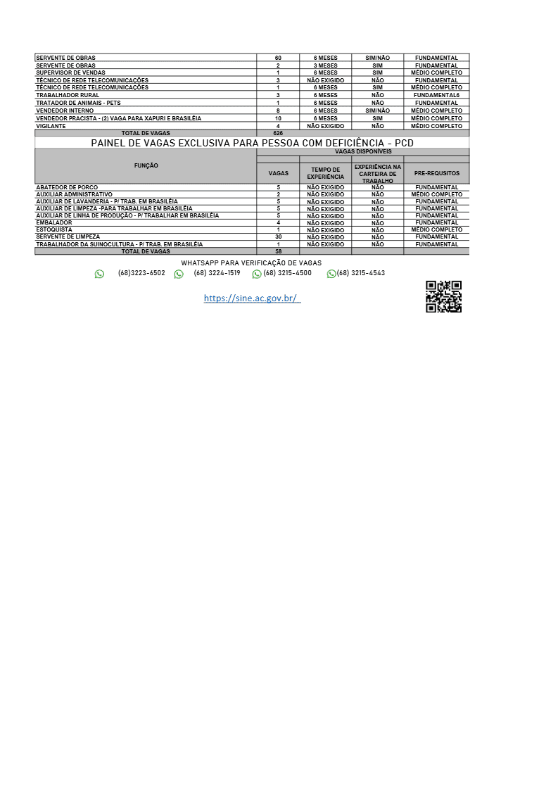 Do total de vagas ofertadas, 58 são destinadas exclusivamente a pessoas com deficiência (PCDs), reforçando o compromisso do Sine com a inclusão social e a ampliação do acesso ao mercado de trabalho.