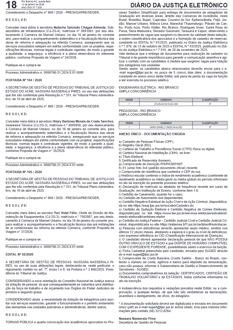 O Tribunal de Justiça do Acre (TJAC) publicou nesta quarta-feira, 13, o Edital nº 02/2026, que trata da quarta convocação de acadêmicos aprovados no processo seletivo simplificado para estágio de graduação em diversas áreas.