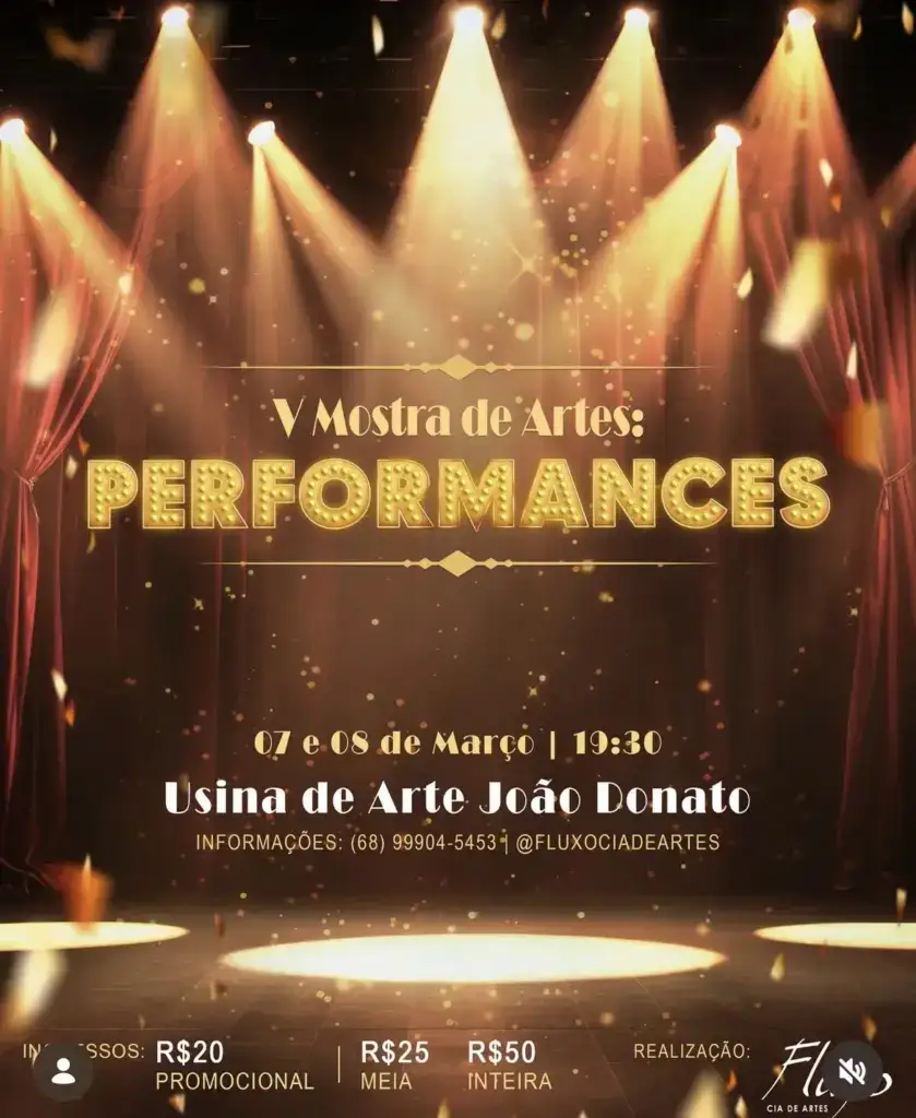 A Fluxo Cia de Artes realiza, nos dias 07 e 08 de março, a V Mostra de Artes, que neste ano traz como tema central as Performances. O evento acontece a partir das 19h30, na Usina de Arte João Donato, e propõe ao público uma imersão em experiências artísticas que dialogam com diferentes linguagens e sensações.