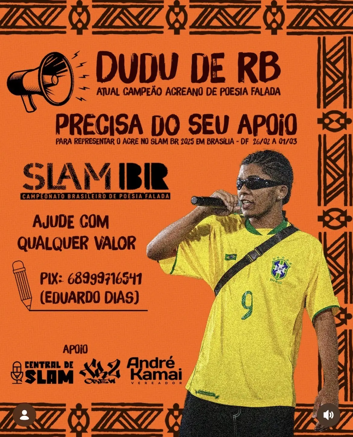 Agora, é a vez do Acre ocupar esse espaço. Apoiar Dudu de RB é apoiar a cultura, a arte periférica e a potência da palavra falada.