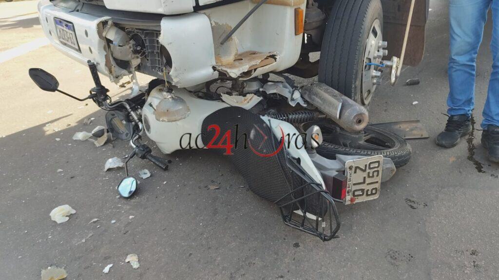 Um acidente de trânsito envolvendo um caminhão e uma motocicleta deixou Jairiane Lima de Oliveira, de 32 anos, ferida, e o seu filho, de 14 anos, com escoriações, na tarde desta sexta-feira (20), no cruzamento das ruas Minas Gerais e Pernambuco, no bairro Dom Giocondo, em Rio Branco.