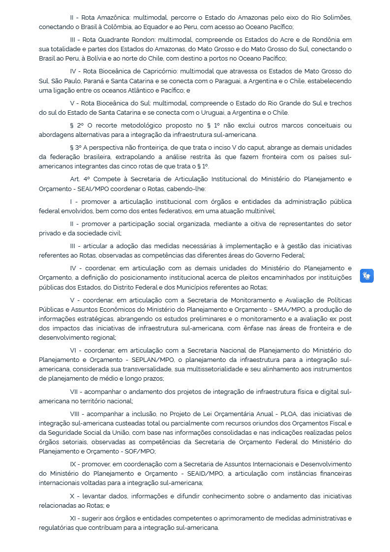 A coordenação do programa ficará a cargo da Secretaria de Articulação Institucional do Ministério do Planejamento e Orçamento, que deverá dialogar com governos estaduais e municipais, além de acompanhar projetos de infraestrutura no território nacional relacionados à integração sul-americana. Para o Acre, isso significa a possibilidade de articulação direta de demandas locais com o planejamento estratégico federal de longo prazo.