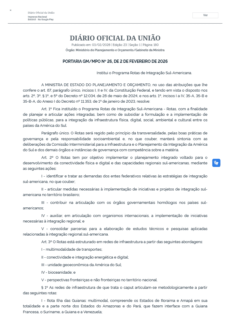 Uma portaria publicada no Diário Oficial da União nesta terça-feira (3) instituiu o Programa Rotas de Integração Sul-Americana e colocou o Acre no centro de uma das principais estratégias federais para a conexão do Brasil com países vizinhos e com o Oceano Pacífico. O estado integra, de forma integral, a chamada Rota Quadrante Rondon, um dos cinco eixos estruturantes do programa.