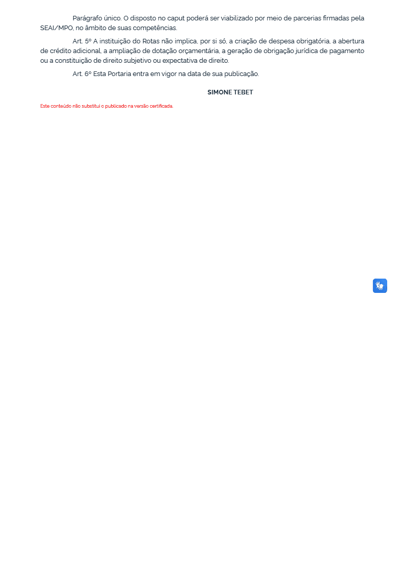 A portaria também estabelece que a criação do programa não implica, automaticamente, novas despesas ou a abertura de créditos adicionais no Orçamento da União. No entanto, o acompanhamento da inclusão de iniciativas no Projeto de Lei Orçamentária Anual está entre as atribuições da coordenação do Rotas, o que mantém aberta a possibilidade de futuros investimentos estruturantes no estado.