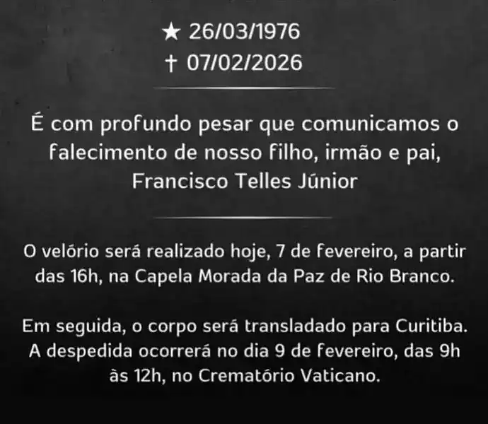 O empresário Francisco Júnior Telles, proprietário da loja Ferracre, que faleceu nesse sábado (7), aos 50 anos, em Rio Branco, foi velado na capela do cemitério Morada da Paz até às 18h30 de ontem. Após a cerimônia, conforme comunicado da família, o corpo foi transladado para Curitiba (PR), onde ocorrerá a despedida final.