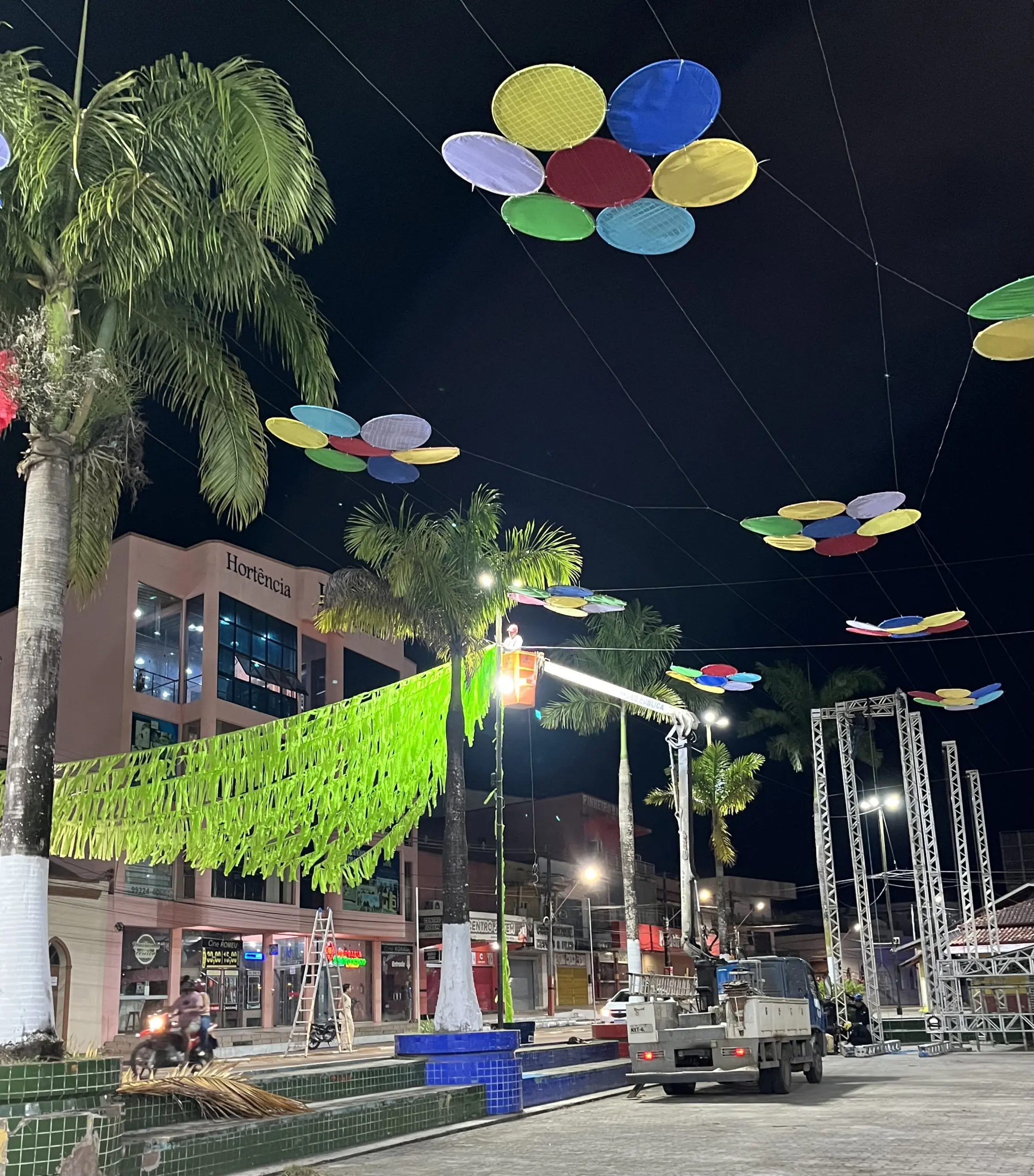 Na noite dessa terça-feira, 10, as equipes de iluminação e ornamentação da Prefeitura de Cruzeiro do Sul instalaram novas luminárias na região central e trocaram outras. O colorido da ornamentação já chama a atenção de quem passa pelo local. As barracas onde ficarão os empreendedores também estão sendo montadas.