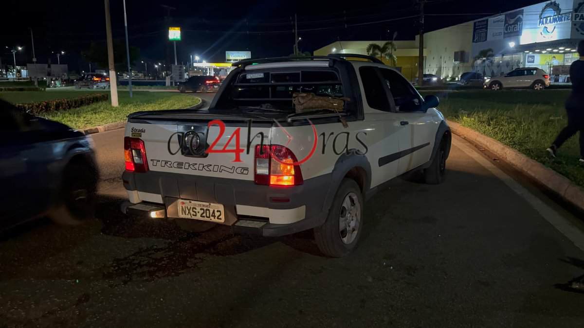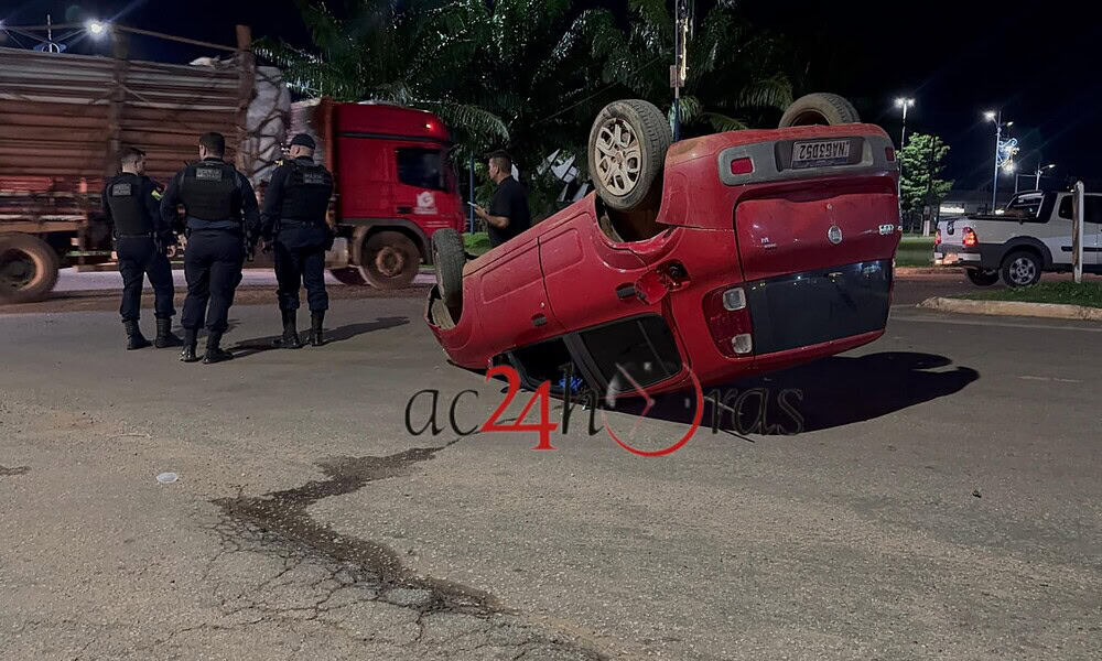 Um acidente envolvendo um Fiat Uno vermelho e um Fiat Strada branco terminou com um dos veículos capotado na noite desta segunda-feira (9), na rotatória da Corrente, localizada na BR-364, no Segundo Distrito de Rio Branco.