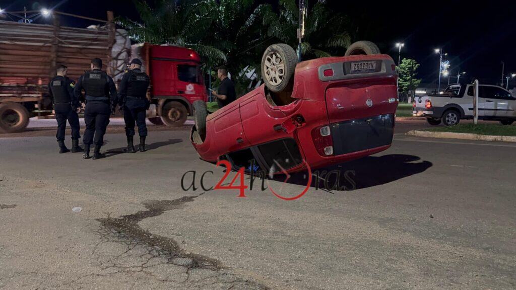 Um acidente envolvendo um Fiat Uno vermelho e um Fiat Strada branco terminou com um dos veículos capotado na noite desta segunda-feira (9), na rotatória da Corrente, localizada na BR-364, no Segundo Distrito de Rio Branco.