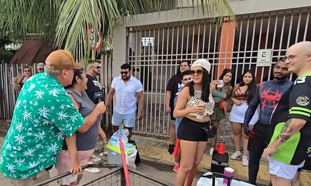 Entre uma coleta e outra, ela também interage com os foliões, elogia fantasias e mantém o clima leve. “Que fantasia bonita essa sua”, diz a uma participante.