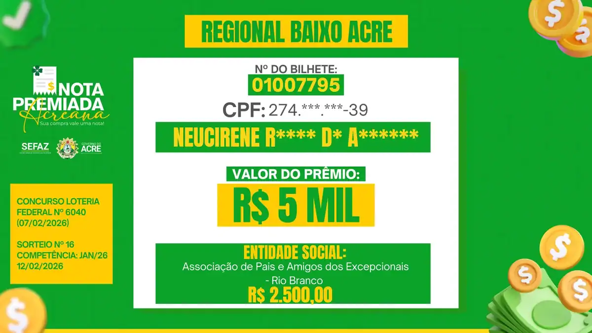 Ao todo, foram contemplados três ganhadores mensais em cada uma das cinco regionais do estado (Alto Acre, Baixo Acre, Juruá, Purus e Tarauacá-Envira), com prêmios nos valores de R$ 5 mil, R$ 10 mil e R$ 20 mil, gerados a partir de notas fiscais emitidas no mês de janeiro deste ano.