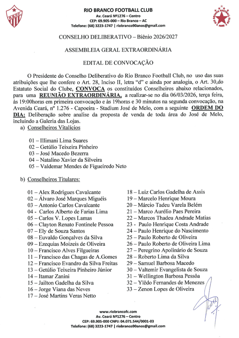 O futuro de um dos espaços mais tradicionais do futebol acreano será discutido no próximo dia 6 de março. O Conselho Deliberativo do Rio Branco Football Club convocou nesta segunda-feira, 23, uma Assembleia Geral Extraordinária para analisar a proposta de venda do terreno que abriga o Estádio José de Melo, incluindo também a Galeria das Lojas existente no local.