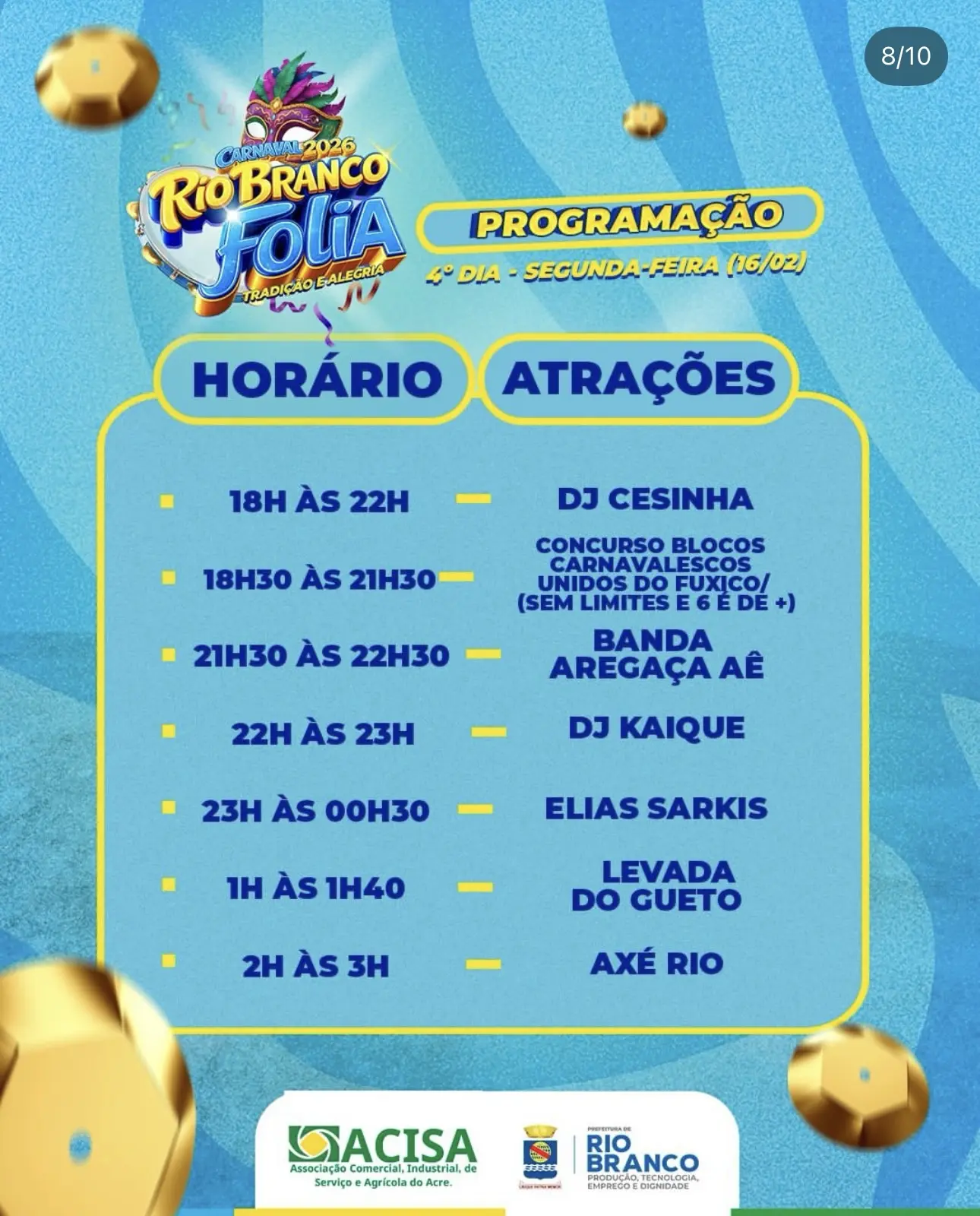 A programação do quarto dia do Carnaval Rio Branco Folia, Tradição e Alegria ocorre nesta segunda-feira (16) com atrações musicais e o concurso dos blocos carnavalescos na Praça da Revolução. A festa inicia às 18h com apresentação do DJ Cesinha e segue até a madrugada.