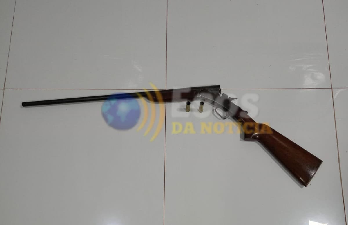 Diante dos relatos da vítima e das testemunhas, os policiais deram voz de prisão ao suspeito. Com autorização da vítima, proprietária do imóvel, foi realizada uma busca no interior da residência, onde foi localizada uma espingarda calibre 32, com uma munição na câmara e uma cápsula deflagrada nas proximidades. O armamento e as munições foram apreendidos.