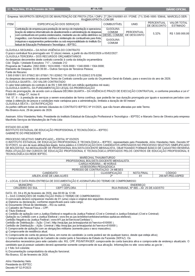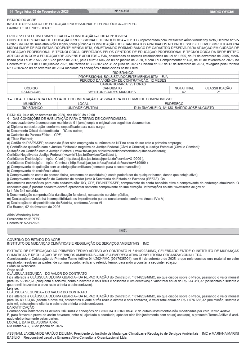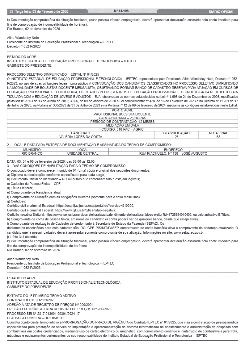 Também foi publicada convocação referente ao mesmo edital para atuação no município de Porto Acre, na função de mediação em sala, com 25 horas semanais e contrato de 12 meses. Nesse caso, a entrega de documentos ocorre na Unidade Central do Ieptec, em Rio Branco, entre os dias 3 e 5 de fevereiro de 2026.
