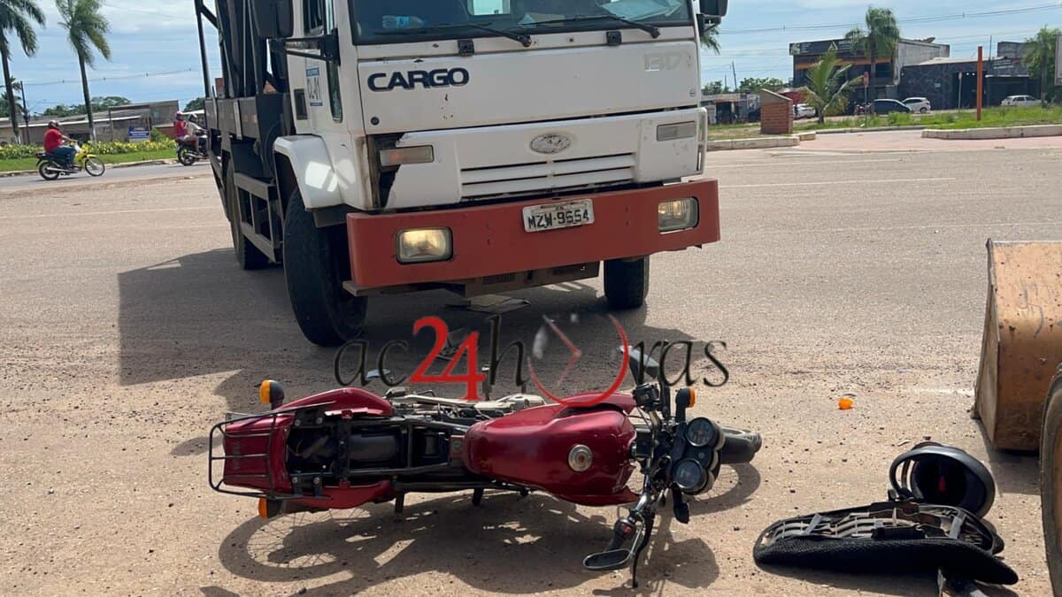 Um acidente de trânsito envolvendo uma motocicleta, um caminhão e um trator da Prefeitura de Rio Branco deixou feridos o motociclista Rondinele Alves Gomes, de 36 anos, e a passageira Maria de Fátima Costa Silva, de 48 anos, na Avenida Amadeu Barbosa, no bairro Comarca, região do Segundo Distrito da capital acreana.