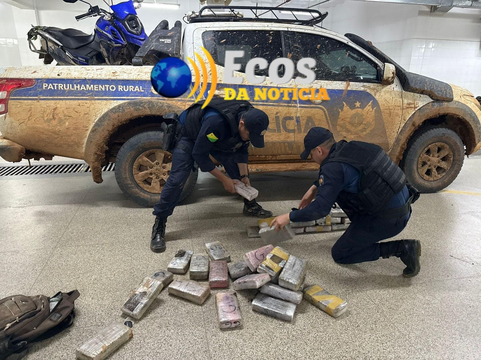 Em buscas realizadas em uma área de mata nas proximidades, foram encontradas duas mochilas contendo 34 barras de maconha. Diante do material, os abordados admitiram que faziam o transporte da droga para uma terceira pessoa.