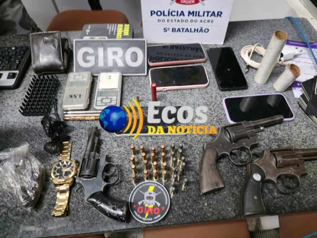 Durante a operação, foram apreendidos três revólveres, calibres .38 e .32, todos municiados, além de diversas munições de diferentes calibres. No interior do imóvel, os policiais encontraram aparelhos celulares, balanças de precisão e porções de substâncias aparentando ser cocaína e maconha, entre outros objetos.