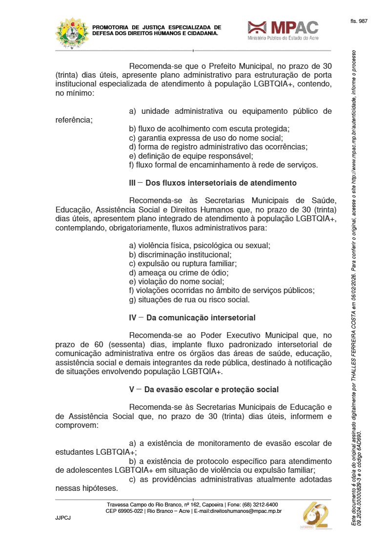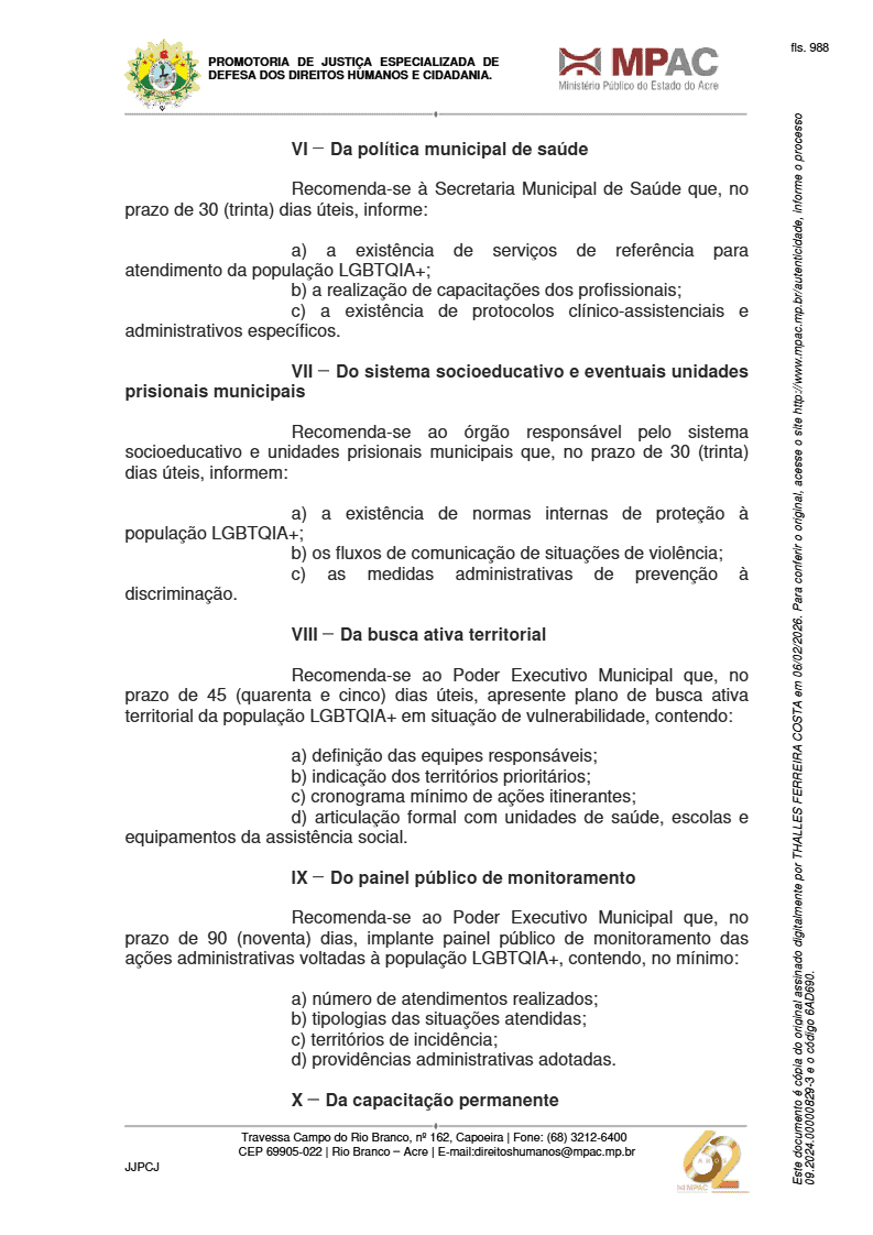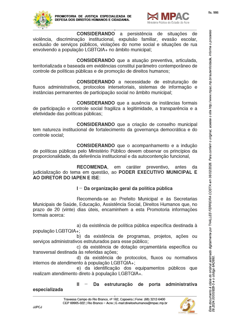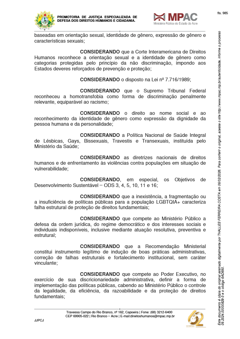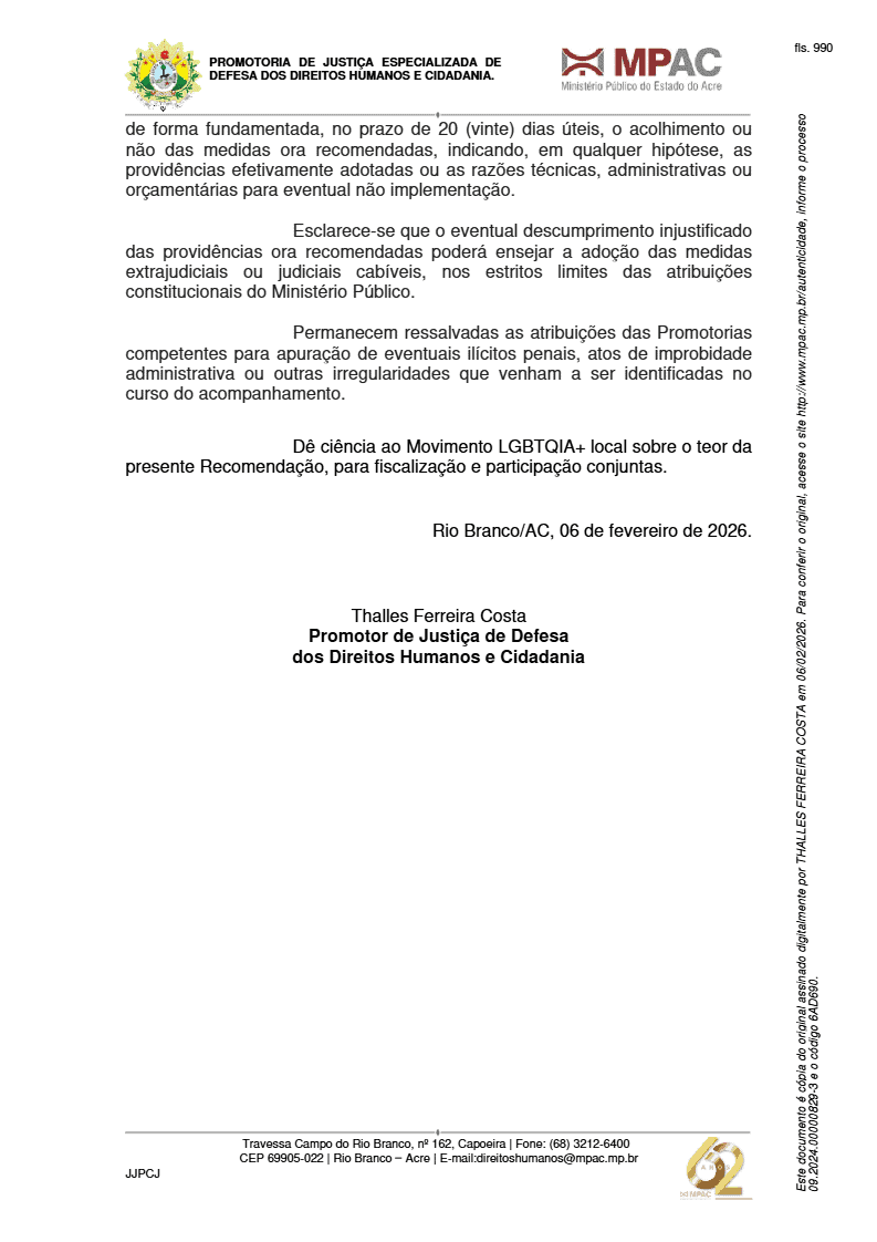 O Ministério Público do Estado do Acre (MPAC), por meio da Promotoria de Justiça com atribuição em Direitos Humanos, expediu a Recomendação Ministerial nº 01/2026 orientando a Prefeitura de Rio Branco, secretarias municipais e órgãos do sistema socioeducativo e prisional a estruturarem políticas públicas específicas voltadas à população LGBTQIA+. O documento foi obtido pela reportagem do ac24horas.