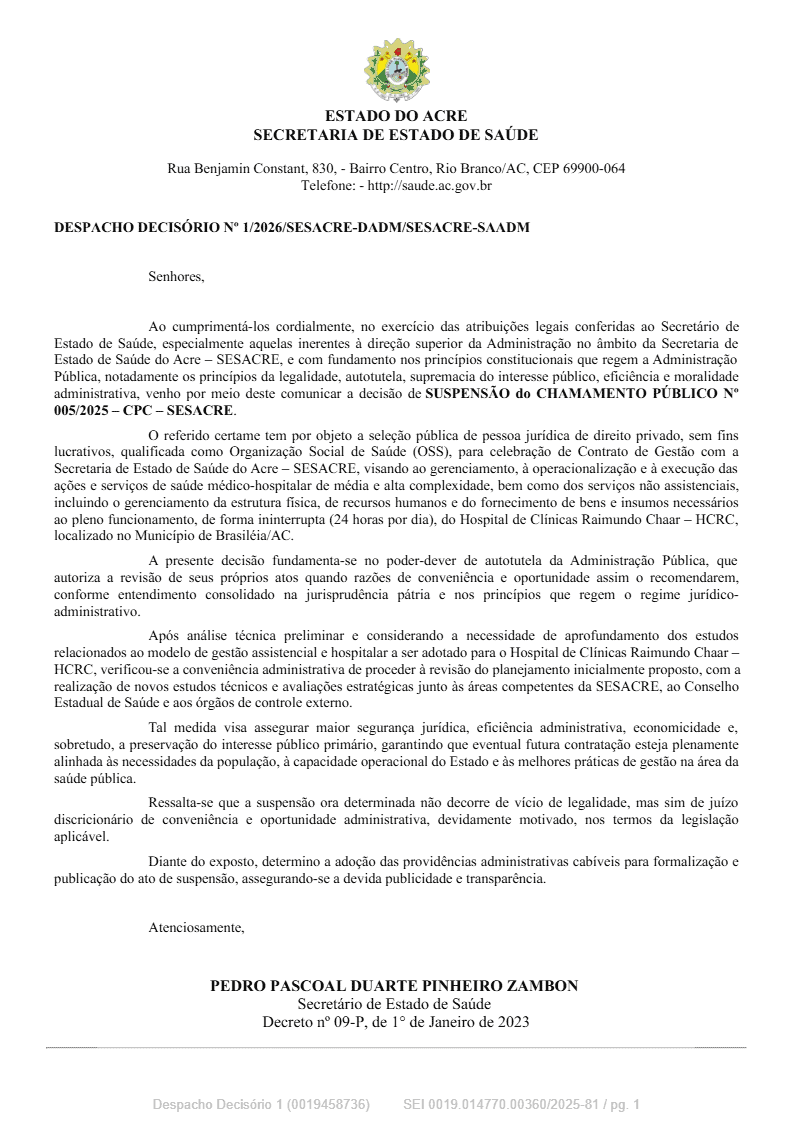 “Após análise técnica preliminar e considerando a necessidade de aprofundamento dos estudos relacionados ao modelo de gestão assistencial e hospitalar a ser adotado para o Hospital de Clínicas Raimundo Chaar – HCRC, verificou-se a conveniência administrativa de proceder à revisão do planejamento inicialmente proposto, com a realização de novos estudos técnicos e avaliações estratégicas junto às áreas competentes da SESACRE, ao Conselho Estadual de Saúde e aos órgãos de controle externo. Tal medida visa assegurar maior segurança jurídica, eficiência administrativa, economicidade e, sobretudo, a preservação do interesse público primário, garantindo que eventual futura contratação esteja plenamente alinhada às necessidades da população, à capacidade operacional do Estado e às melhores práticas de gestão na área da saúde pública”, justifica o gestor.