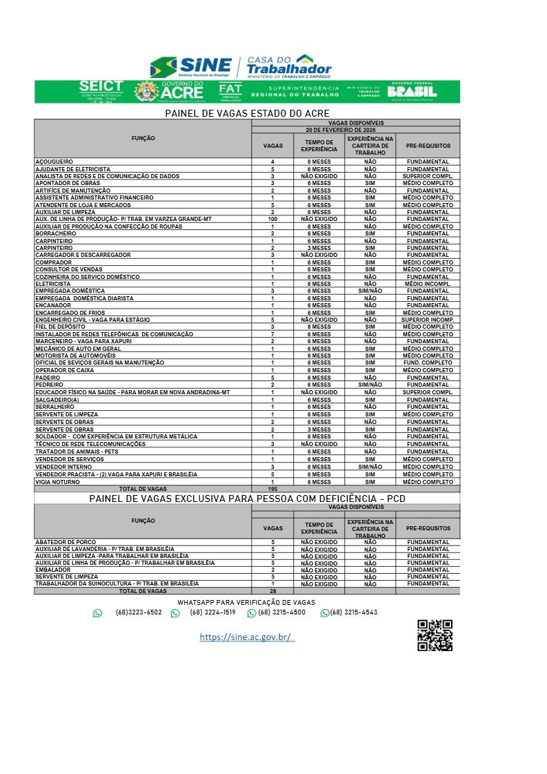 O Sistema Nacional de Emprego no Acre (Sine) disponibiliza, nesta sexta-feira, 20, um total de 223 vagas de trabalho para candidatos de diferentes níveis de escolaridade e áreas de atuação. Do total de oportunidades, 28 são destinadas exclusivamente a pessoas com deficiência (PCDs).