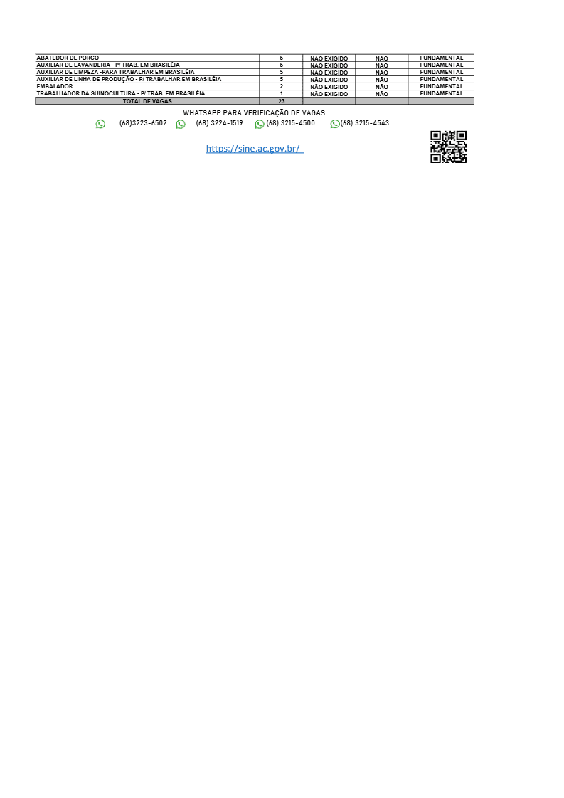 Entre as funções com maior número de oportunidades estão servente de obras, pedreiro, auxiliar de linha de produção, carpinteiro, repositor de supermercado, selecionador de castanha e armador de ferro. Também há vagas para operador de caixa, vendedor, eletricista, motorista e cozinheiro, entre outras ocupações.