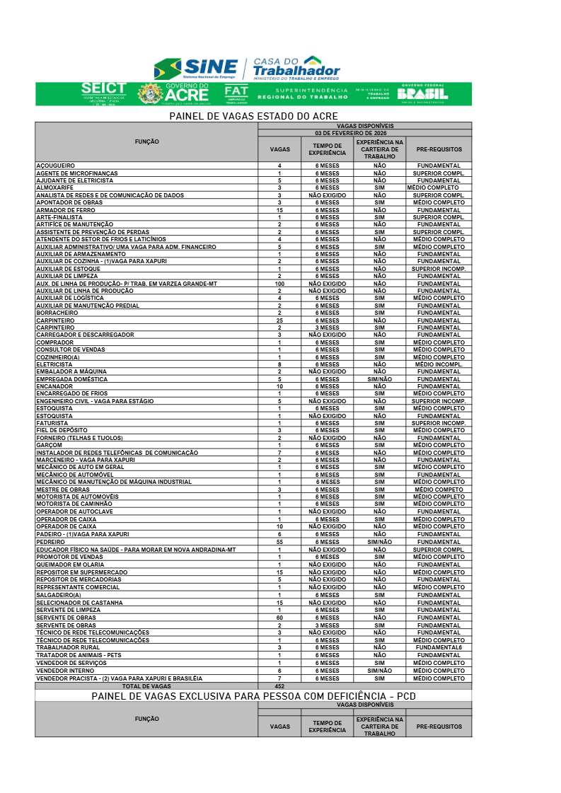 O Sistema Nacional de Emprego (Sine) disponibiliza 475 vagas de trabalho no Acre nesta terça-feira, 3, contemplando ampla concorrência e oportunidades exclusivas para pessoas com deficiência (PCD). As vagas abrangem diferentes áreas de atuação e níveis de escolaridade.