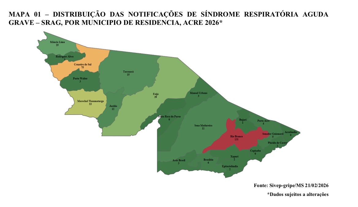 A Secretaria de Estado de Saúde do Acre (Sesacre) divulgou o Boletim Semanal nº 07/2026 com dados atualizados sobre a situação das síndromes respiratórias no estado. O levantamento aponta aumento nos casos de Síndrome Respiratória Aguda Grave (SRAG) nas primeiras semanas de 2026, especialmente relacionados à circulação da Influenza A.