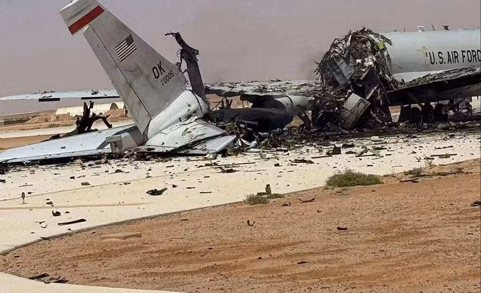 Destroços do avião de vigilância E-3 Sentry, usado para monitoramento aéreo e controle de operações, após ser atingido em ataque na Arábia Saudita — Foto: AFP