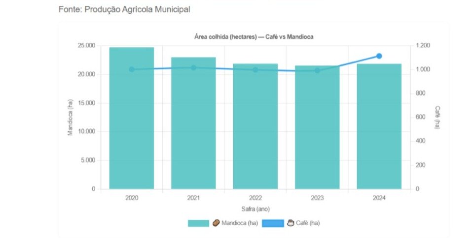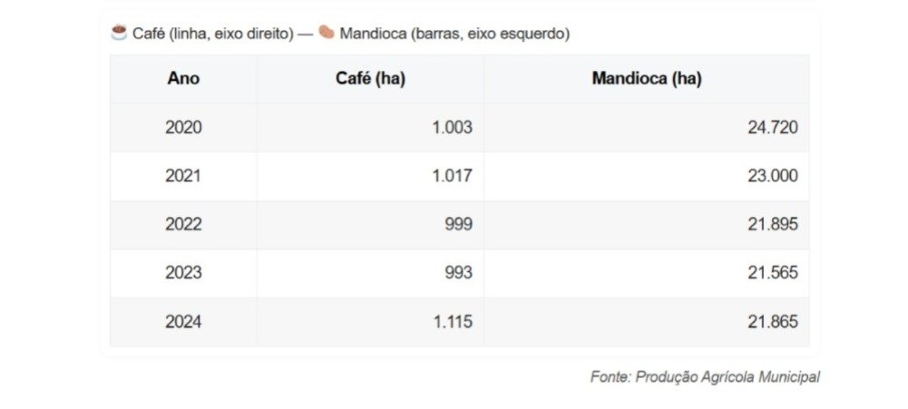 Outro detalhe: há oscilação da área colhida de café (como se vê na tabela), chegando a uma depressão de 999 hectares colhidos em 2022 e 993 em 2023, anos de consequências do contexto da pandemia de Covid-19. Essas oscilações também foram acompanhadas pela área colhida de mandioca. Sem contar outro detalhe: ainda é muito grande a diferença da área dedicada à cultura da mandioca em relação à cultura do café.