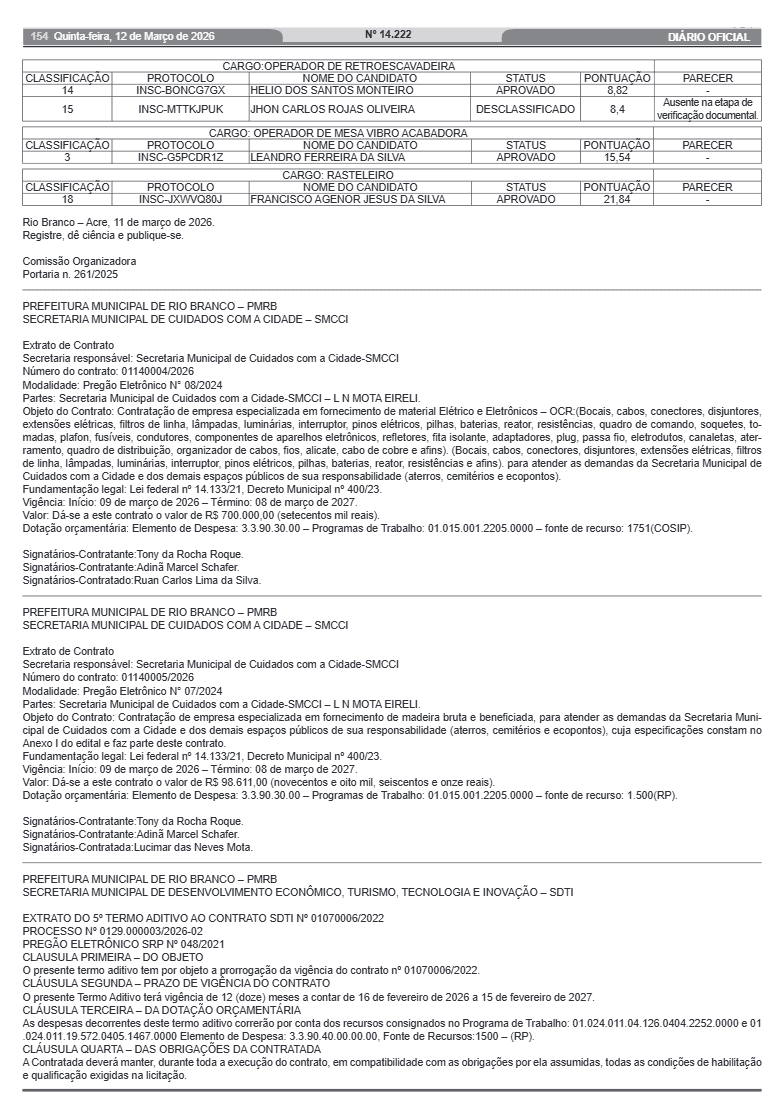 De acordo com a Comissão Organizadora do certame, instituída pela Portaria nº 261/2025, os candidatos aprovados deverão comparecer para entrega dos documentos admissionais no dia 13 de março de 2026, às 8h, na sede administrativa da Emurb, localizada na Estrada da Floresta, nº 1243, bairro Floresta, em Rio Branco.