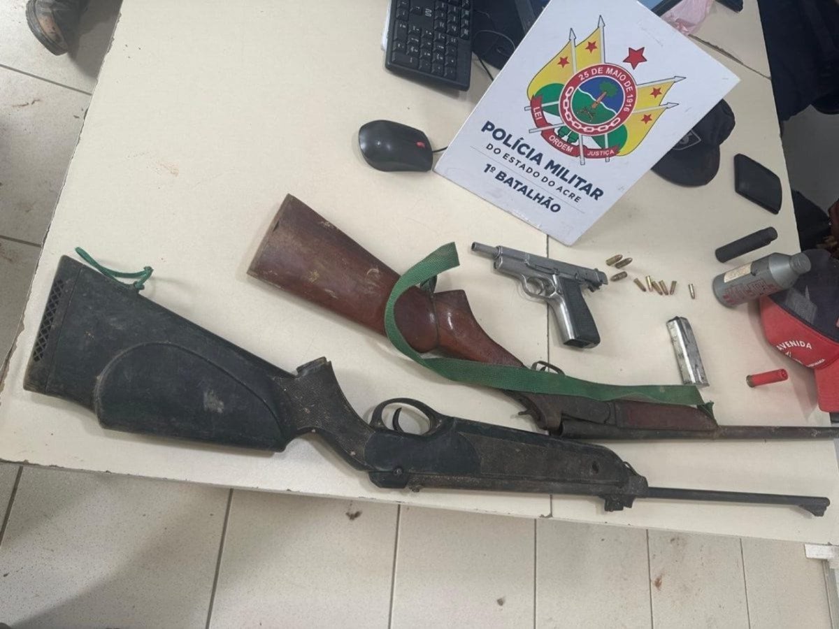 Eliandro de Carvalho Ferreira e Elves de Carvalho Ferreira foram presos e Kenas de Carvalho Ferreira, fugiu. Com eles havia uma pistola 9mm, um Rifle 22 é uma Espingarda 16, que foram apreendidas.