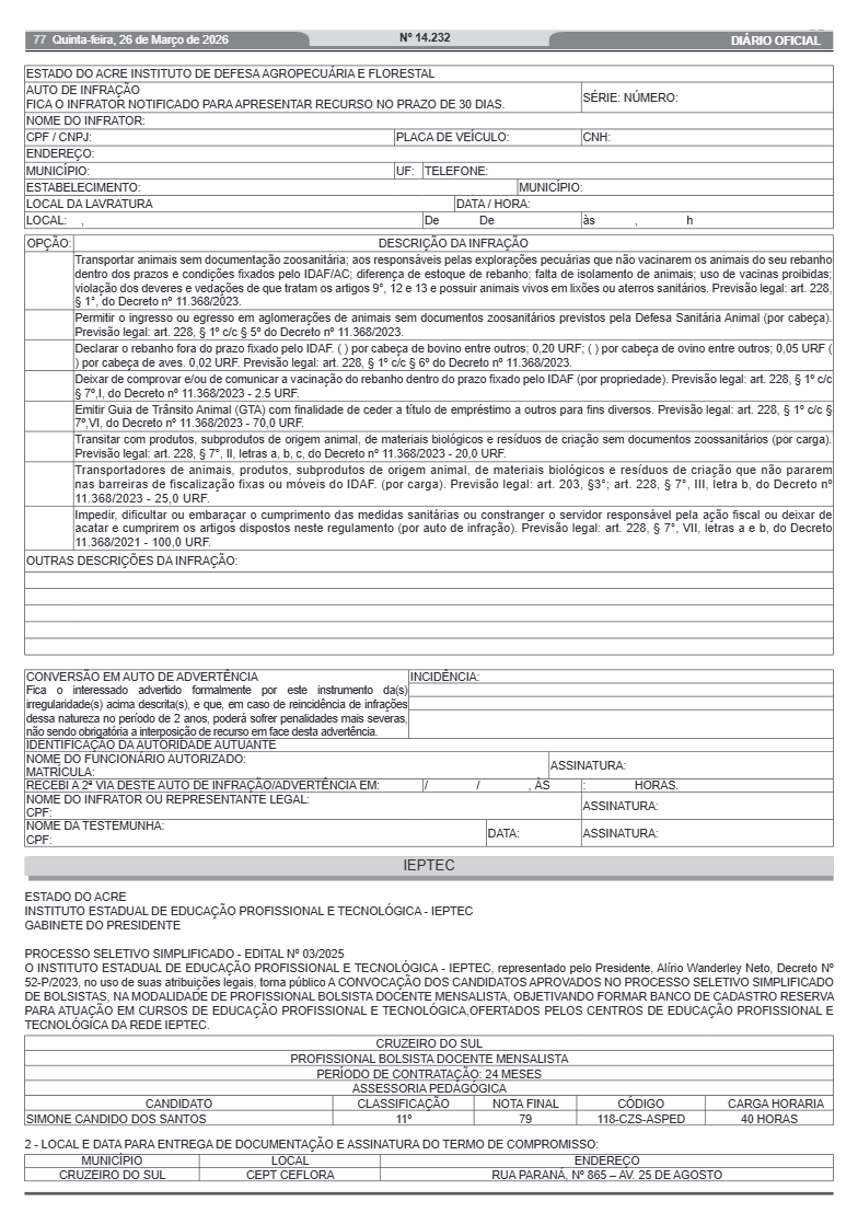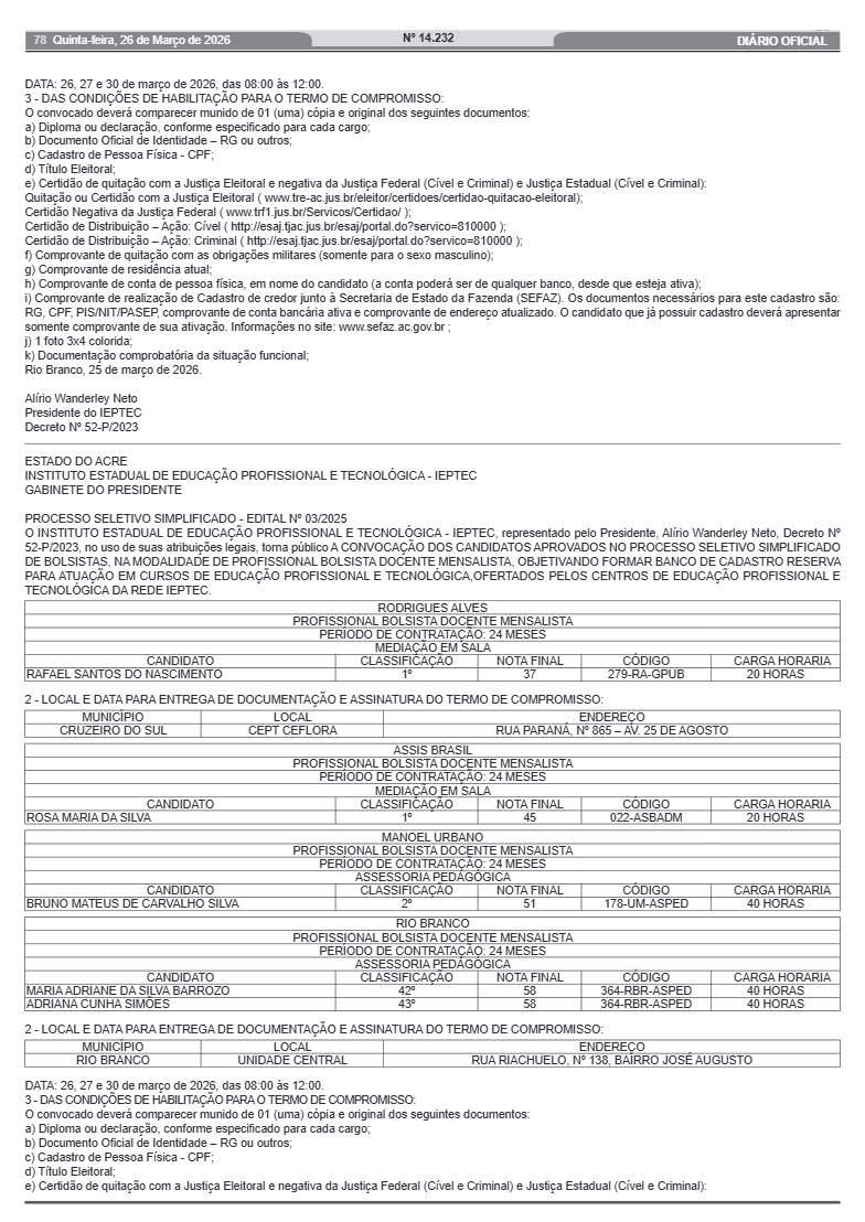 Em Rio Branco, a entrega da documentação e assinatura do termo de compromisso ocorrerá na Unidade Central do IEPTEC, localizada na Rua Riachuelo, nº 138, bairro José Augusto, nos dias 26, 27 e 30 de março de 2026, das 8h às 12h.