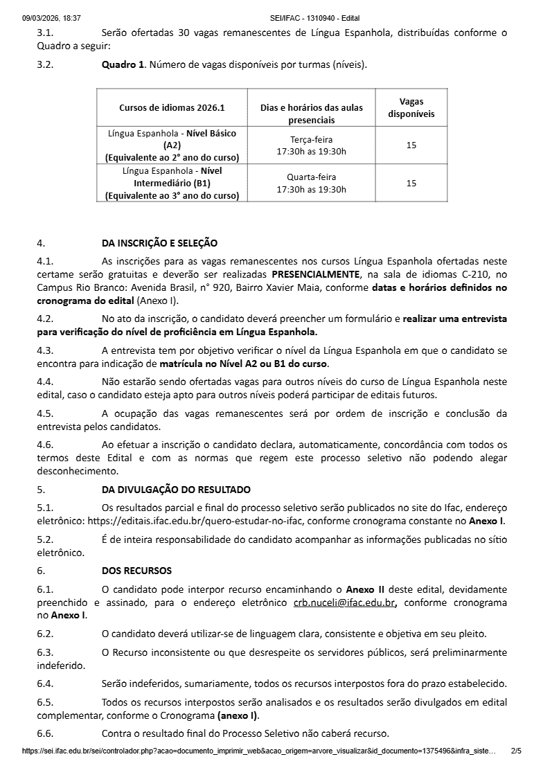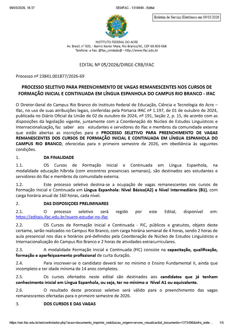 O Instituto Federal do Acre (Ifac) publicou nesta semana o Edital nº 05/2026 abrindo processo seletivo para o preenchimento de vagas remanescentes nos cursos de Formação Inicial e Continuada (FIC) em língua espanhola no Campus Rio Branco. As oportunidades são destinadas a estudantes, servidores da instituição e também à comunidade externa interessada em aprimorar conhecimentos no idioma.