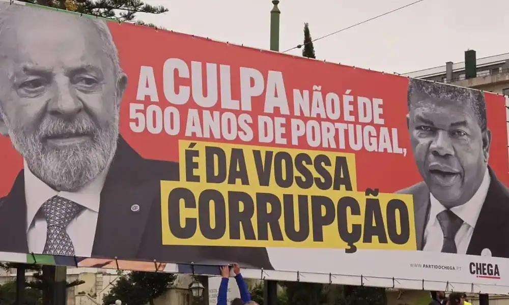 A peça traz imagens do presidente brasileiro Luiz Inácio Lula da Silva (PT) e do presidente de Angola, João Lourenço, acompanhadas da frase: “A culpa não é de 500 anos de Portugal, é da vossa corrupção”.