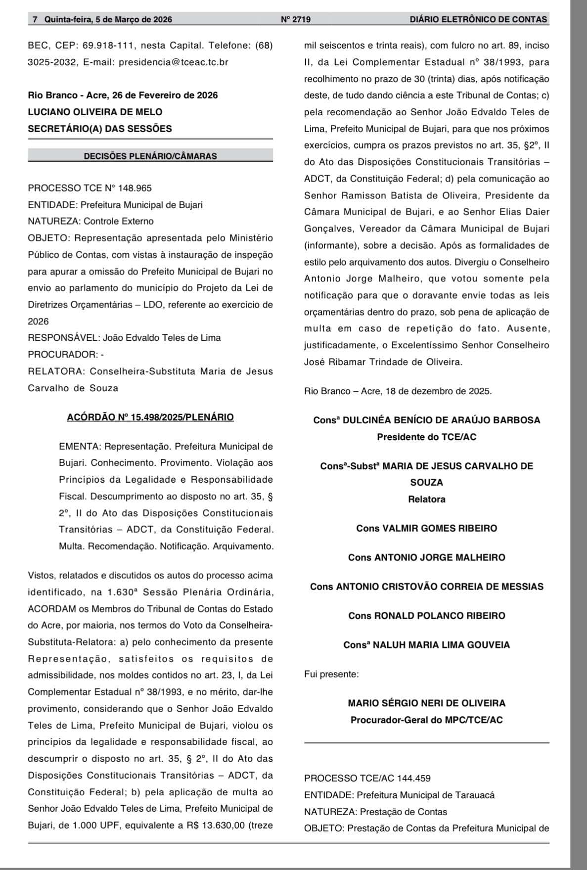 O Tribunal de Contas do Estado do Acre (TCE-AC) aplicou multa ao prefeito de Bujari, João Edvaldo Teles de Lima, o Padeiro, por descumprimento do prazo para envio do Projeto da Lei de Diretrizes Orçamentárias (LDO) de 2026 ao Legislativo municipal. A decisão consta no Diário Eletrônico desta quinta-feira, 5.