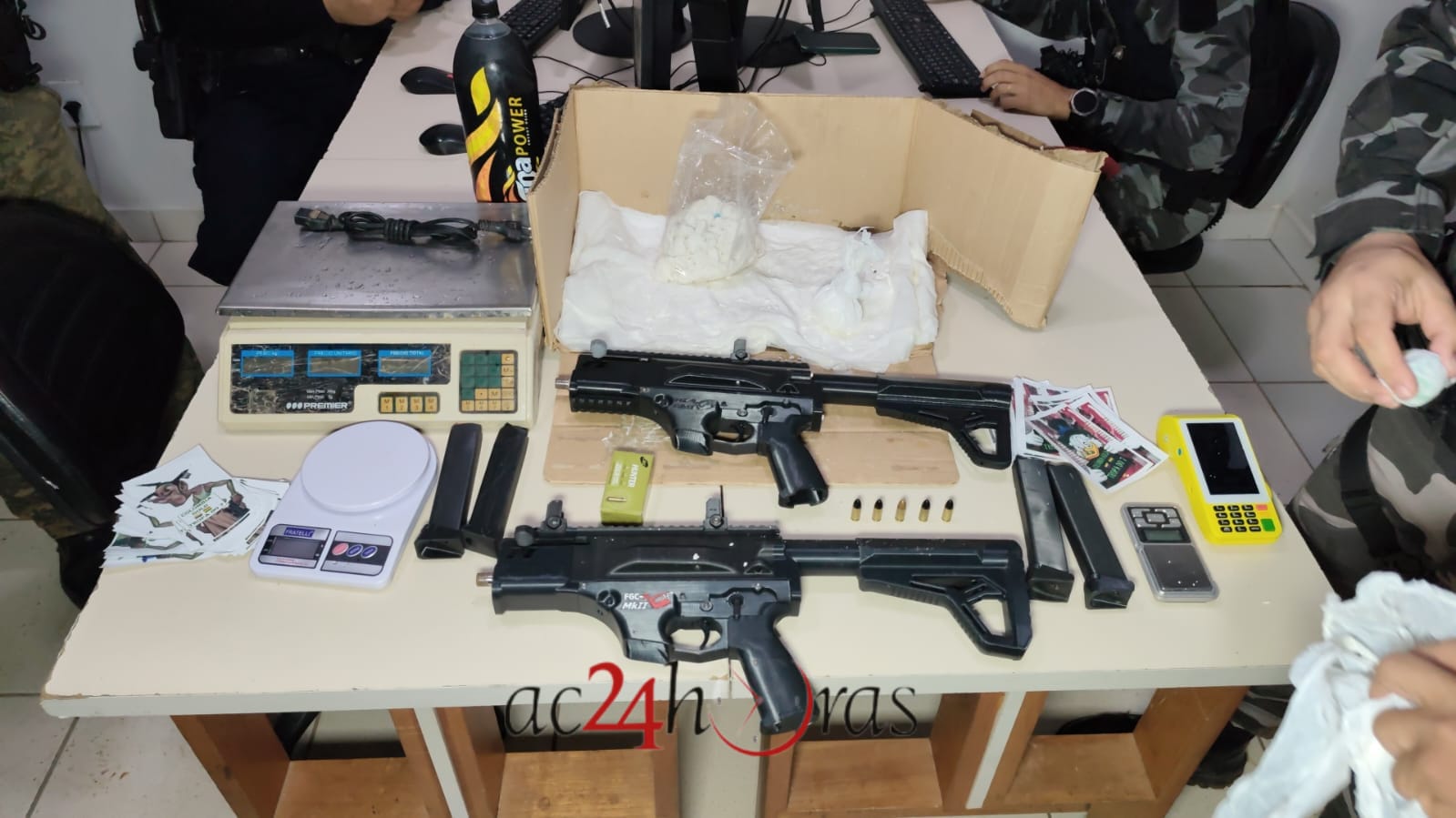O suspeito foi abordado e preso em flagrante. Com ele, foram apreendidas as duas armas, cinco munições, carregadores e uma balança de precisão.